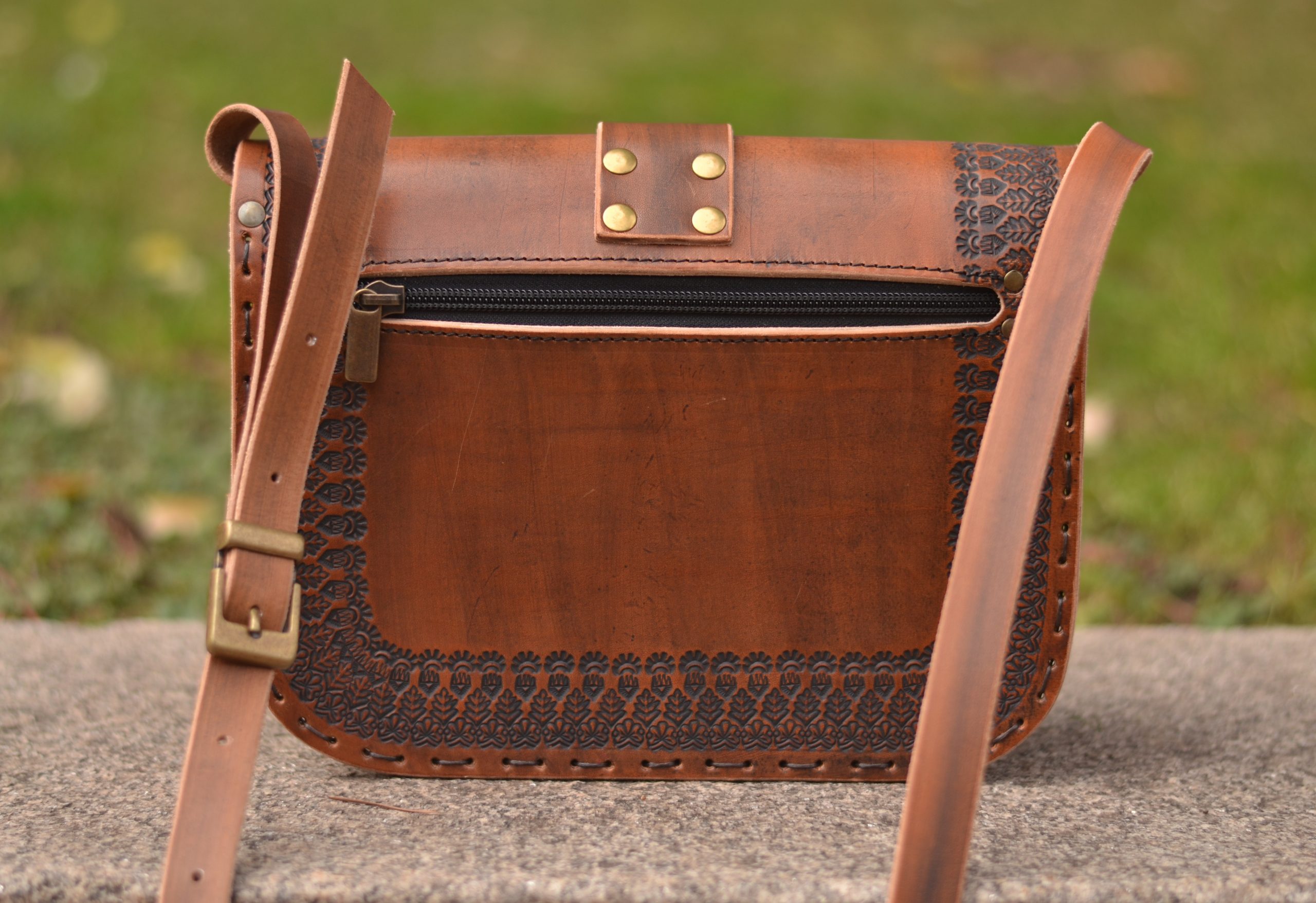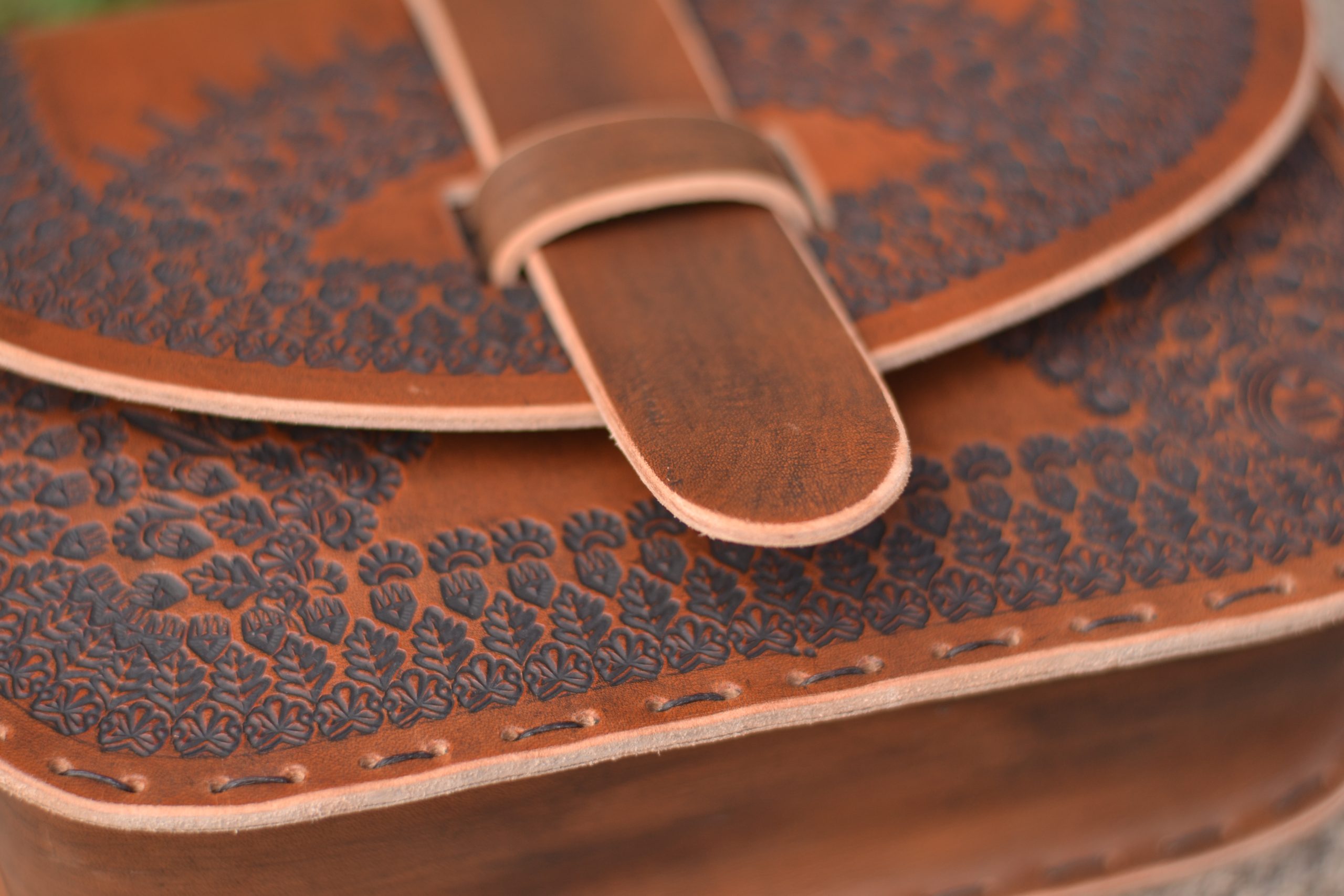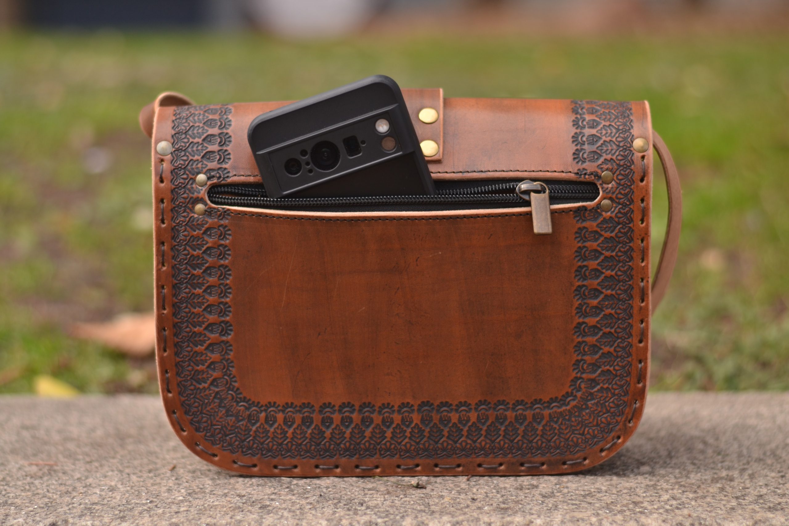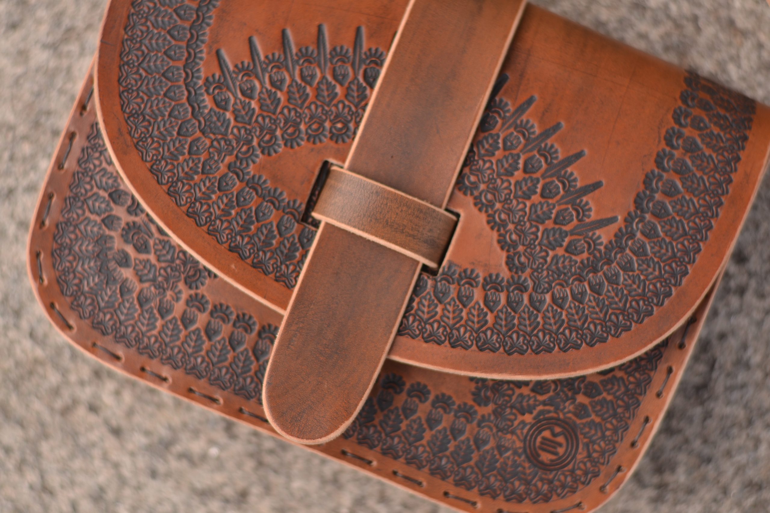 Las dos características que definen su diseño son: el cierre (ingenioso, sencillo y muy seguro) y el cincelado, que en cada pieza es único (característica fundamental de un trabajo artesanal). El color de éste bolso es logrado por un teñido a mano, y un posterior envejecido para lograr ese toque tan especial e irrepetible. Correa regulable y bolsillo de cremallera en el dorso.