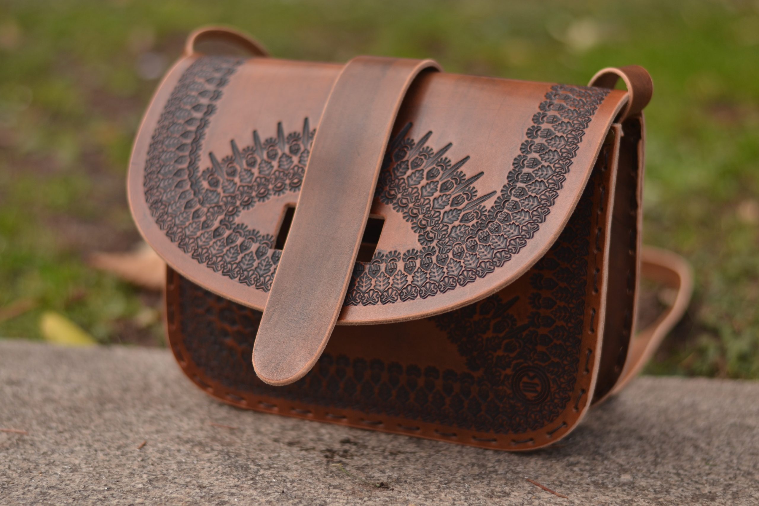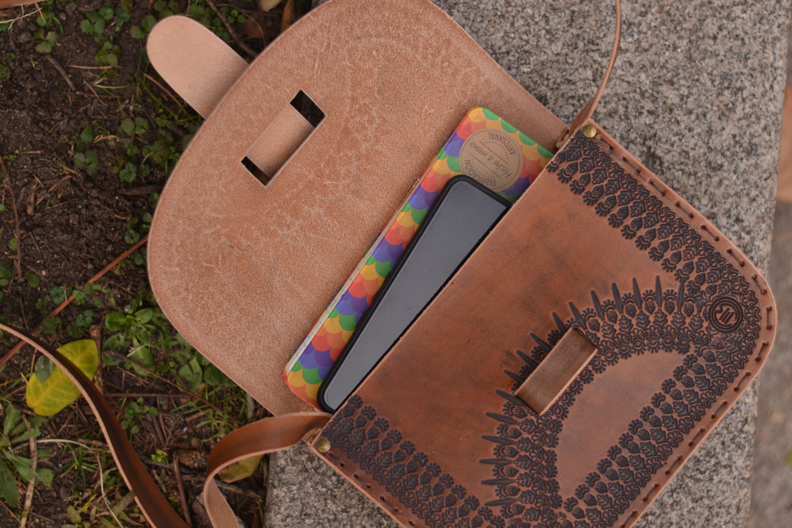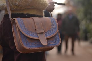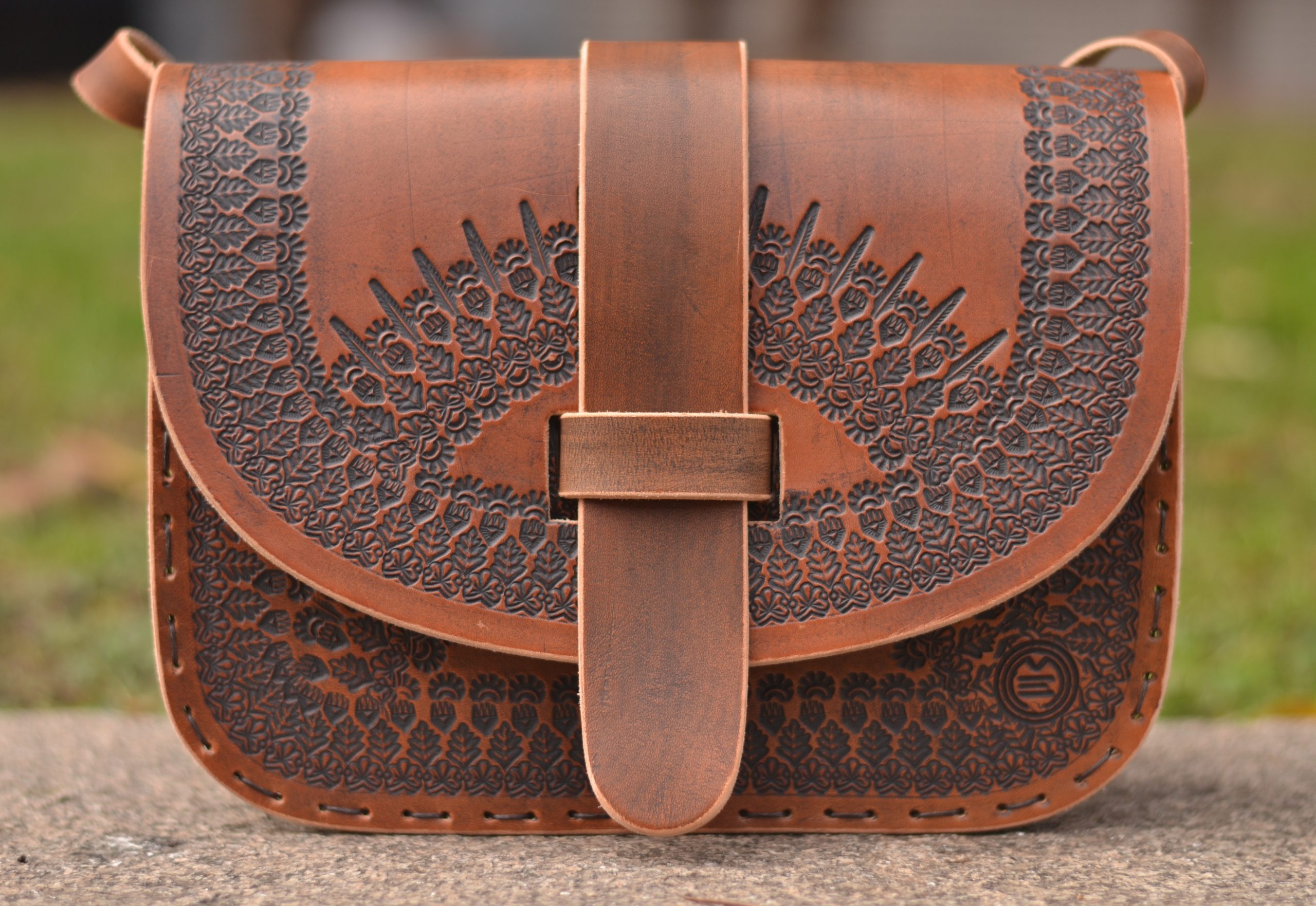 Las dos características que definen su diseño son: el cierre (ingenioso, sencillo y muy seguro) y el cincelado, que en cada pieza es único (característica fundamental de un trabajo artesanal). El color de éste bolso es logrado por un teñido a mano, y un posterior envejecido para lograr ese toque tan especial e irrepetible. Correa regulable y bolsillo de cremallera en el dorso.
