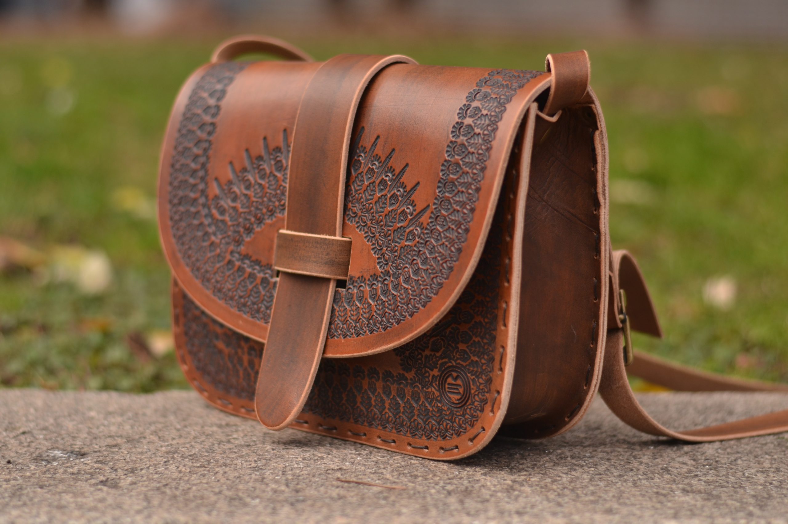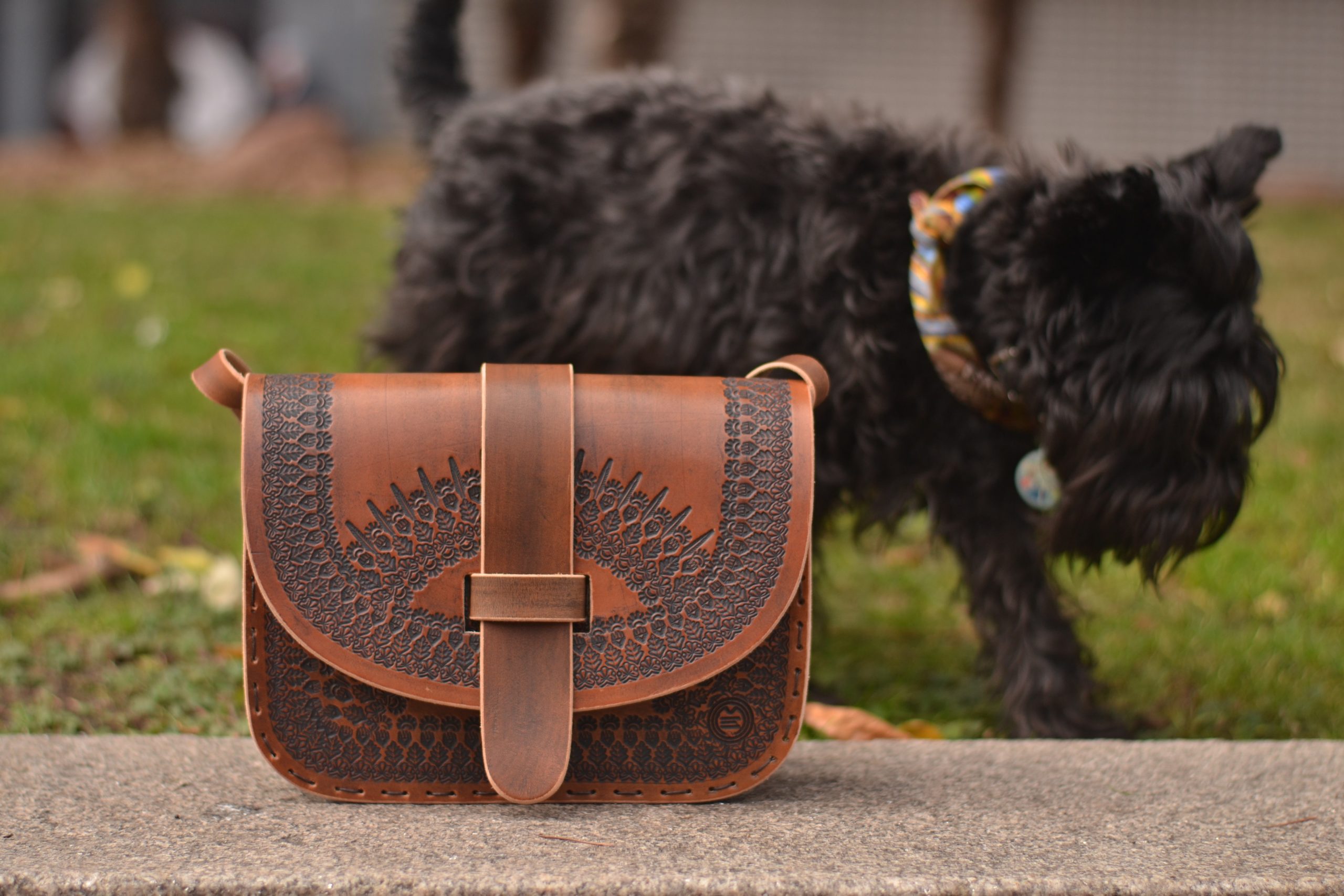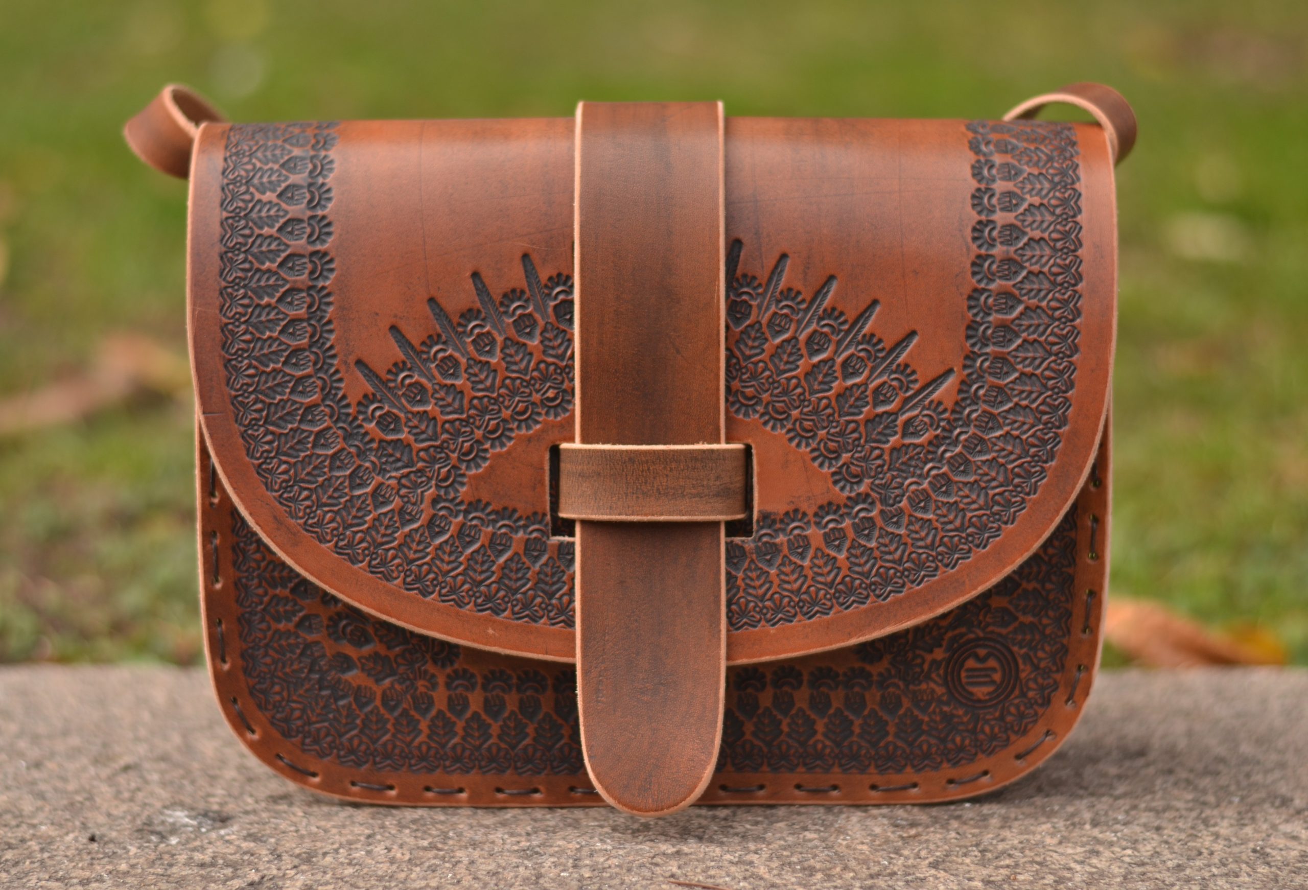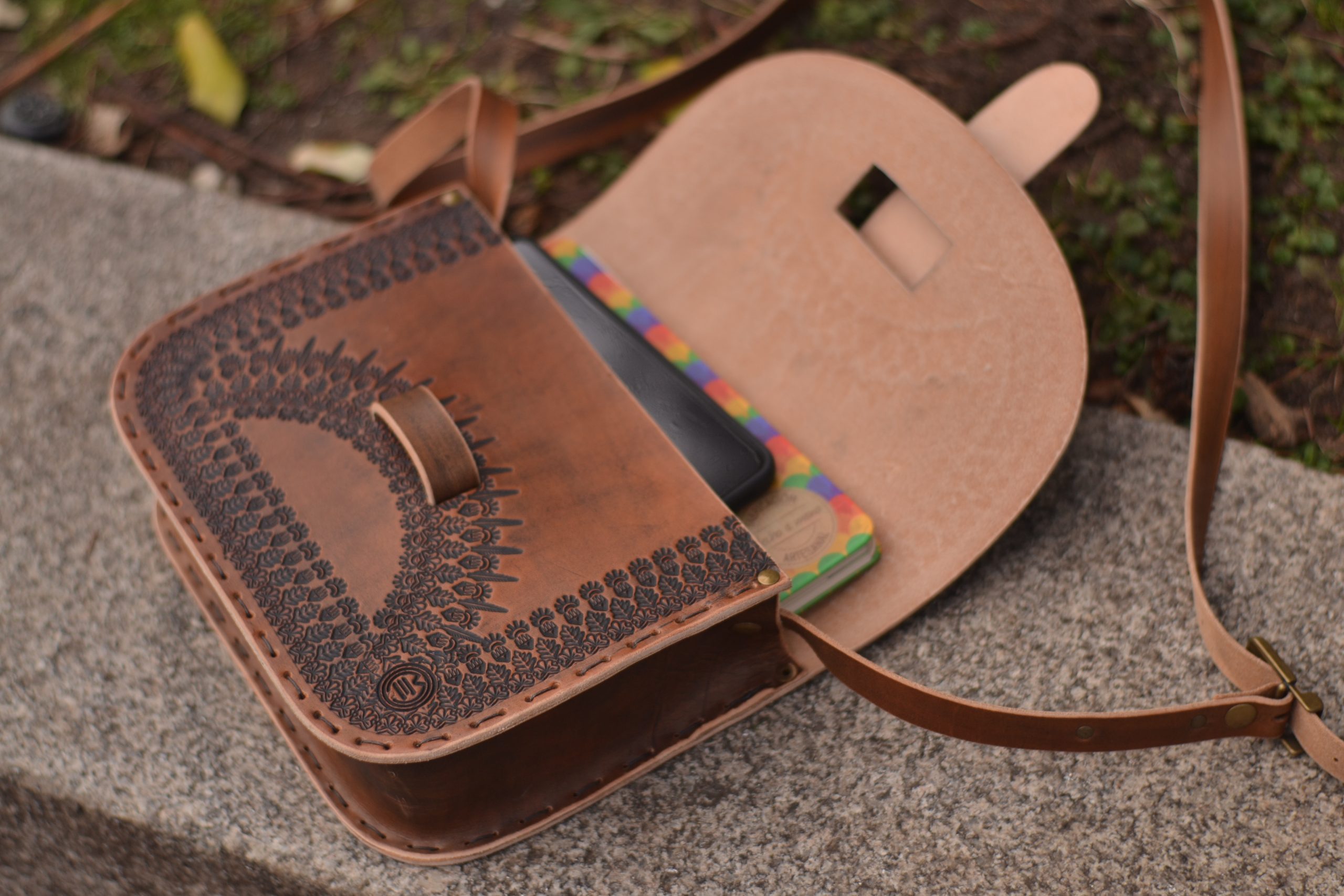 Las dos características que definen su diseño son: el cierre (ingenioso, sencillo y muy seguro) y el cincelado, que en cada pieza es único (característica fundamental de un trabajo artesanal). El color de éste bolso es logrado por un teñido a mano, y un posterior envejecido para lograr ese toque tan especial e irrepetible. Correa regulable y bolsillo de cremallera en el dorso.