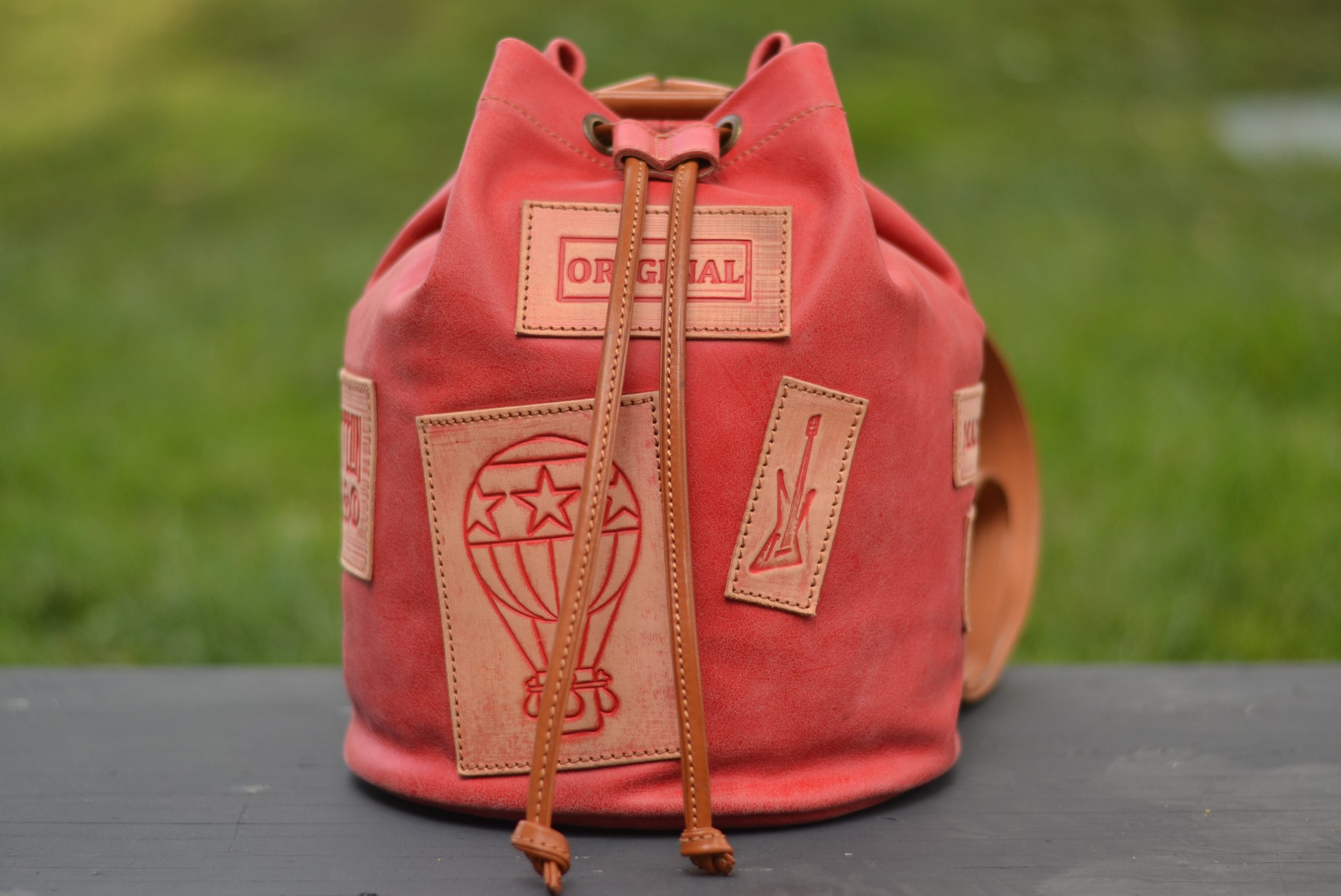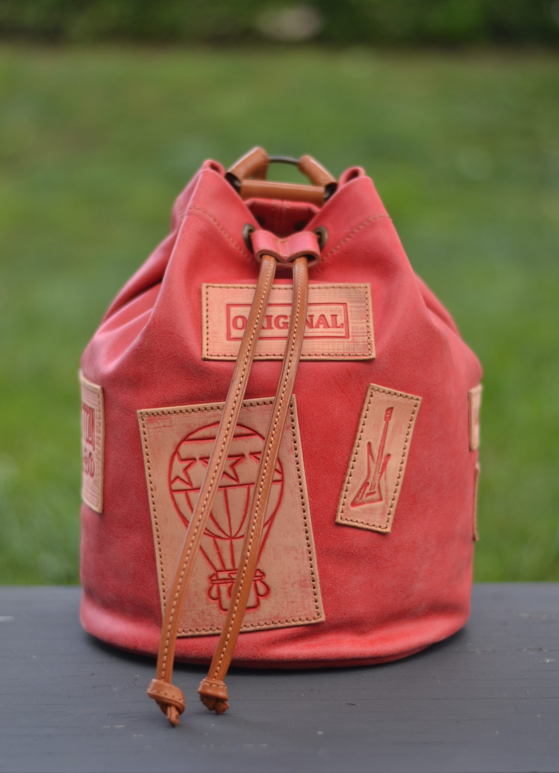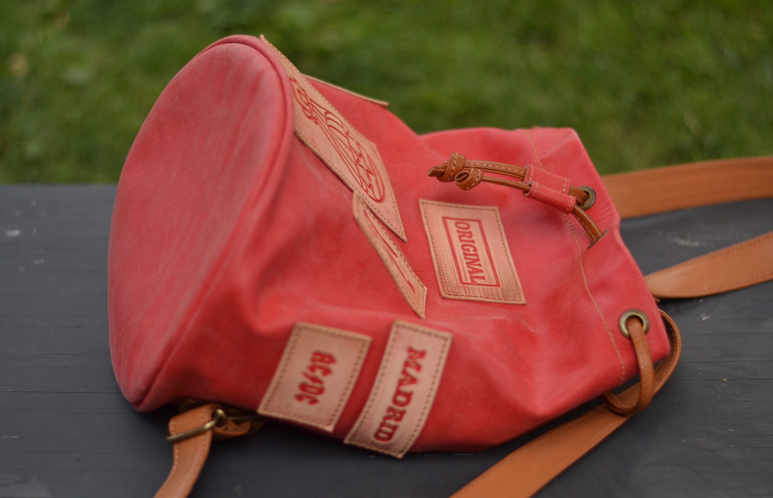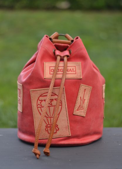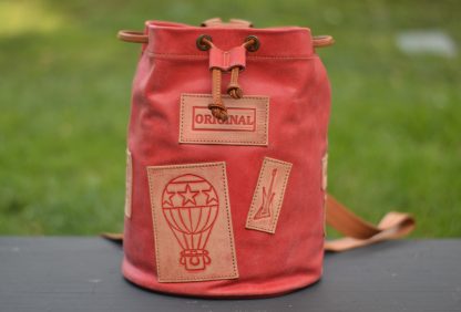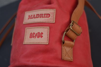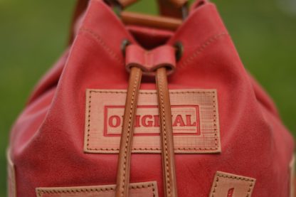 Macuto o Petate marinero, el pequeño de la familia, de carácter rústico y estilo vintage. Rematado con parches de cuero vaquetilla grabados en relieve y envejecidos con nuestra propia técnica.