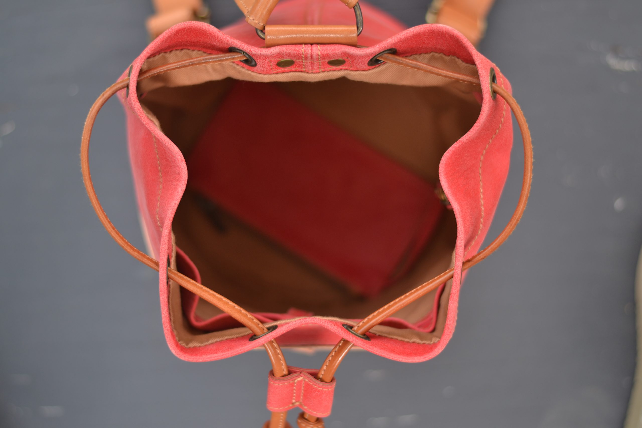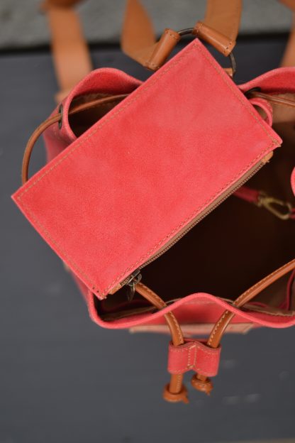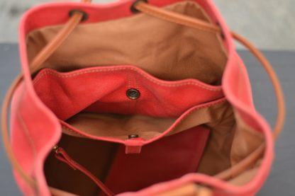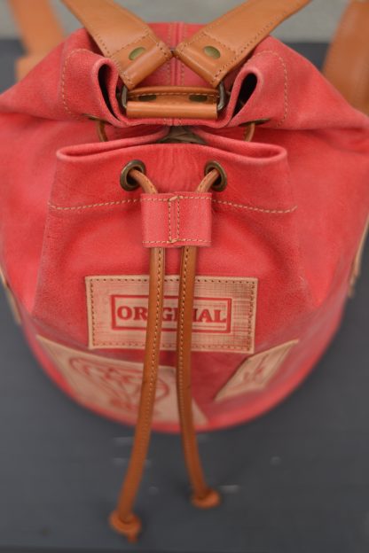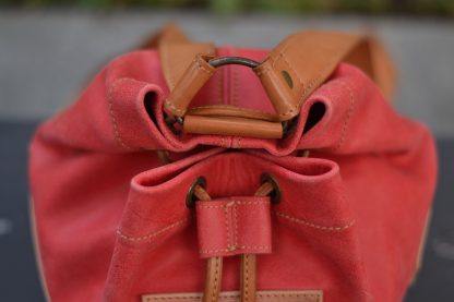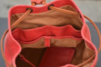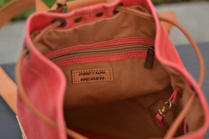 Es una mochila muy cómoda ya que cierra a través de un lazo manual, con un cordón de cuero color natural y cuenta con dos correas regulables.